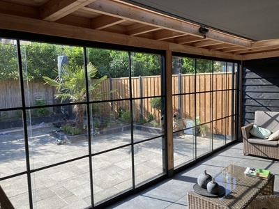 Een steellook schuifwand voor buiten is een glazen schuifwand met slanke, zwarte profielen die de uitstraling van staal nabootsen. Deze glazen wand combineert een industriële look met het comfort van een moderne schuifwand en is speciaal ontworpen voor gebruik bij overkappingen en andere buitenruimtes. Steellook schuifwanden worden vaak toegepast bij veranda’s en terrasoverkappingen omdat ze een luxe en robuuste uitstraling geven, zonder het zware gewicht en onderhoud van echt staal. De verdeling in glasvlakken zorgt voor een strak lijnenspel en behoudt tegelijkertijd maximale lichtinval.